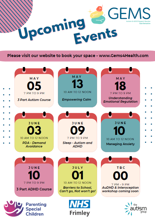 For parent and carers whose child is suspected to have, waiting for an assessment or has been diagnosed with Autism and or ADHD and lives or has a registered GP in East Berkshire (Slough, RBWM or Bracknell).